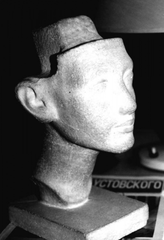 На рабочем столе у окна среди книг и рабочих бумаг выточенная из камня голова Нефертити, подаренная писателем Г.Снегиревым.