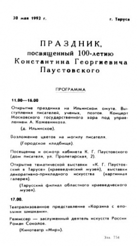 В Тарусе с 1991 года ежегодно проводятся праздники К.Г. Паустовского в день его рождения 31 мая. Первый и второй праздники проводились на Ильинском омуте, на поляне, откуда открываются любимые писателем дали. На праздники приезжают писатели, поэты, журналисты, музыканты, исследователи творчества Паустовского — российские и зарубежные.